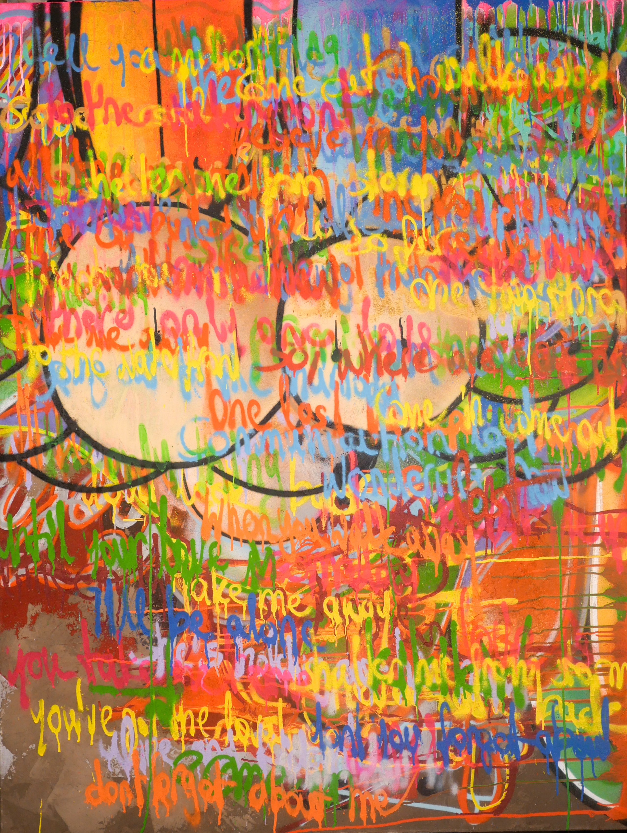 Die überlagerten Worte wirken wie Gedankenfetzen – spontan, roh und ungefiltert. Leuchtende Farben prallen aufeinander, verlaufen, tropfen, verschwimmen. Dahinter scheinen Formen auf, die nie ganz greifbar werden. Das Bild zieht den Betrachter in einen inneren Monolog, in ein Spannungsfeld zwischen Sehnsucht, Überforderung und dem Wunsch nach Ausbruch.