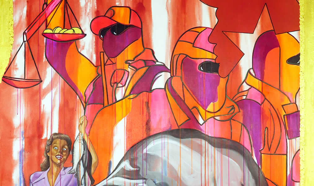 Die Werke verbinden verschiedene visuelle Ebenen: die Graffiti-Ästhetik der Straße, die kühle Perfektion der Werbegrafik und eine subtile, sozialkritische Narration. Jede Leinwand erzählt eine Geschichte über Protest, Wandel und die visuelle Überflutung jener Zeit.